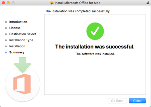12. Installationen af softwaren starter. Klik på Luk, når installationen er færdig. Se Hvad kan du prøve, hvis du ikke kan installere eller aktivere Office til Mac, hvis Microsoft 365-installationen mislykkedes.